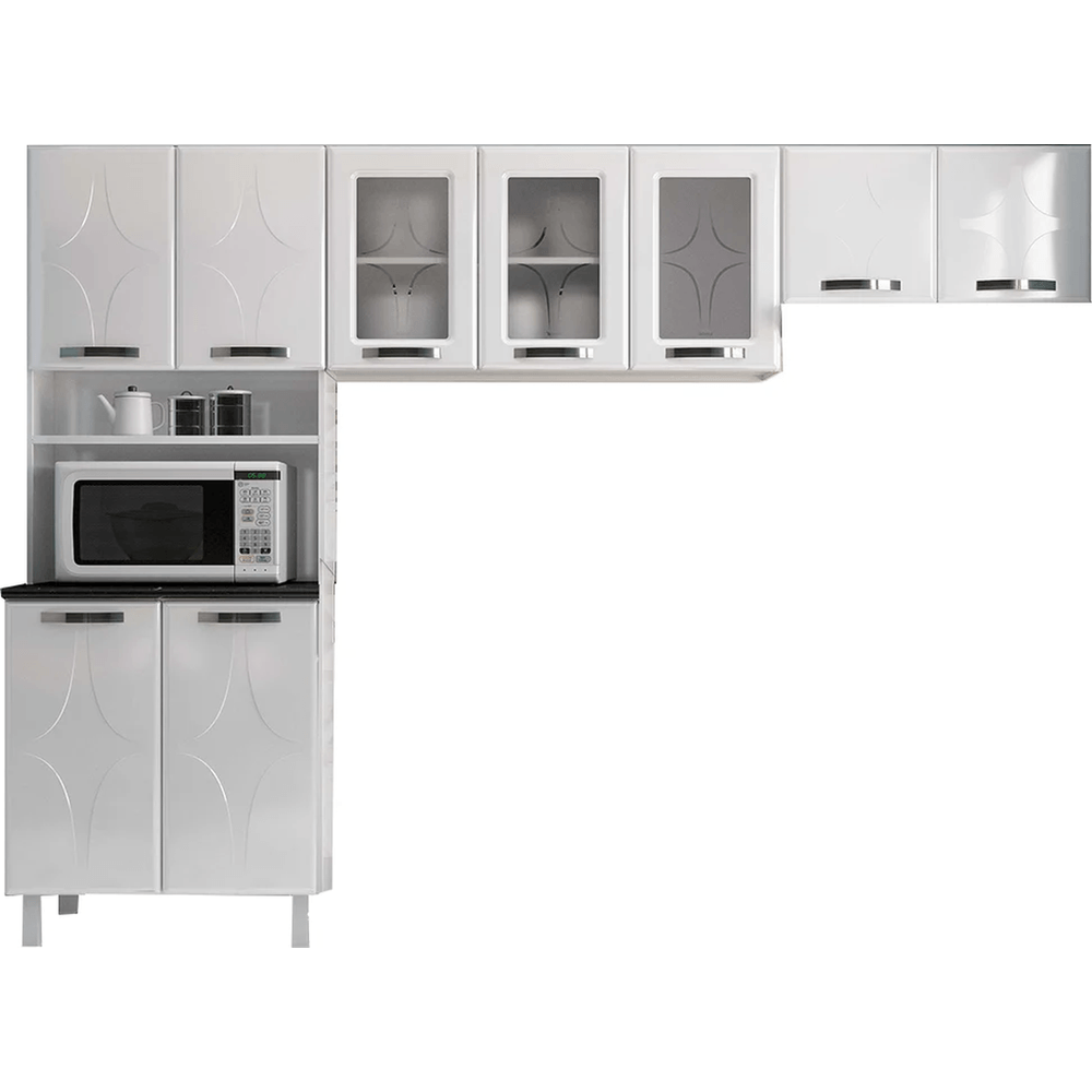 - Amplo Armazenamento: Equipado com paneleiro duplo, armário triplo e armário duplo baixo, com prateleiras para organização de utensílios e louças.