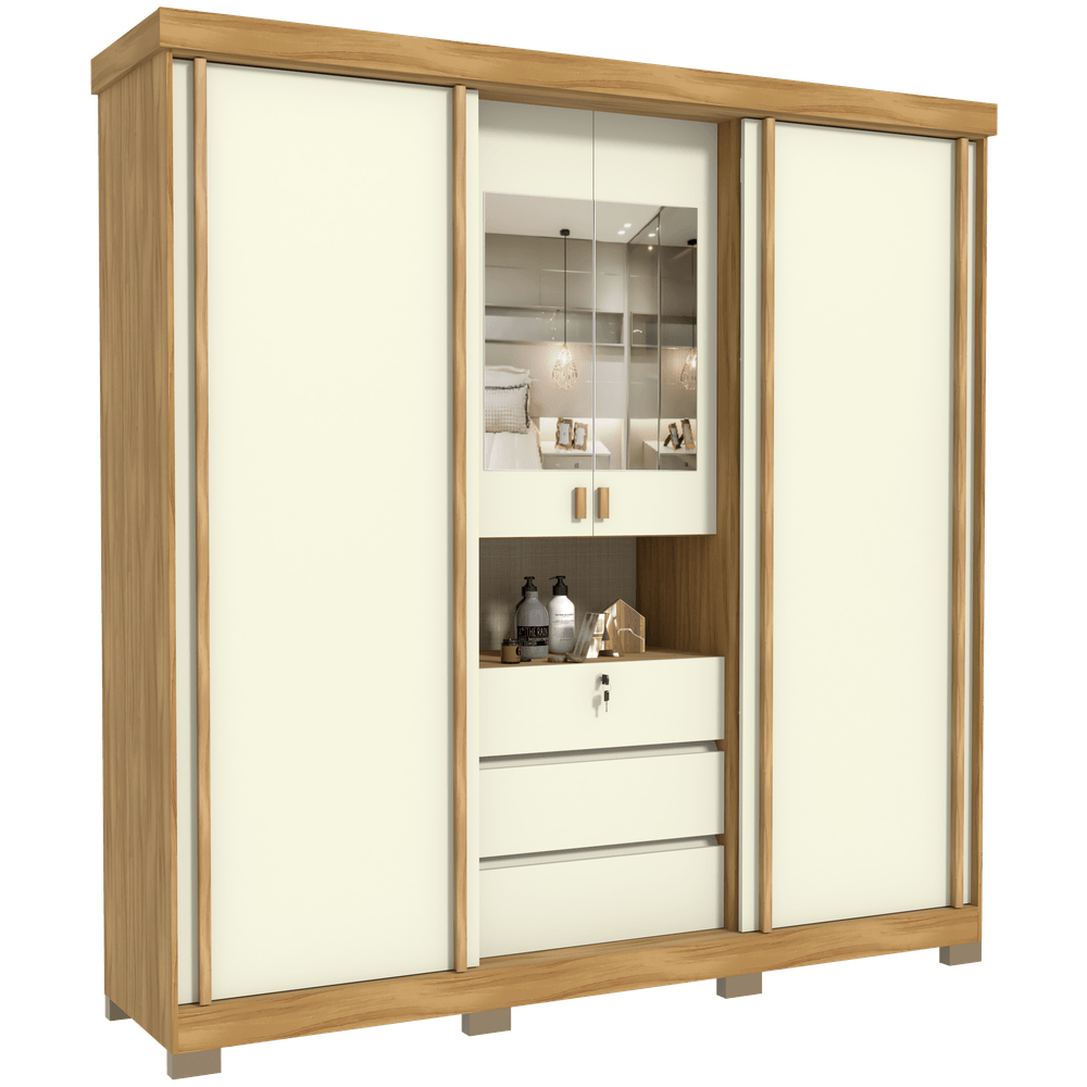 Roupeiro Avelan Master 4 Portas, 3 Gavetas, com Espelho – Freijó/Off White